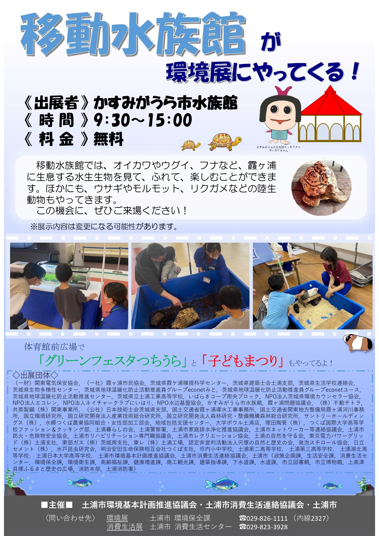 移動水族館や花苗の配布、エコ工作や消防・警察車両の展示など、