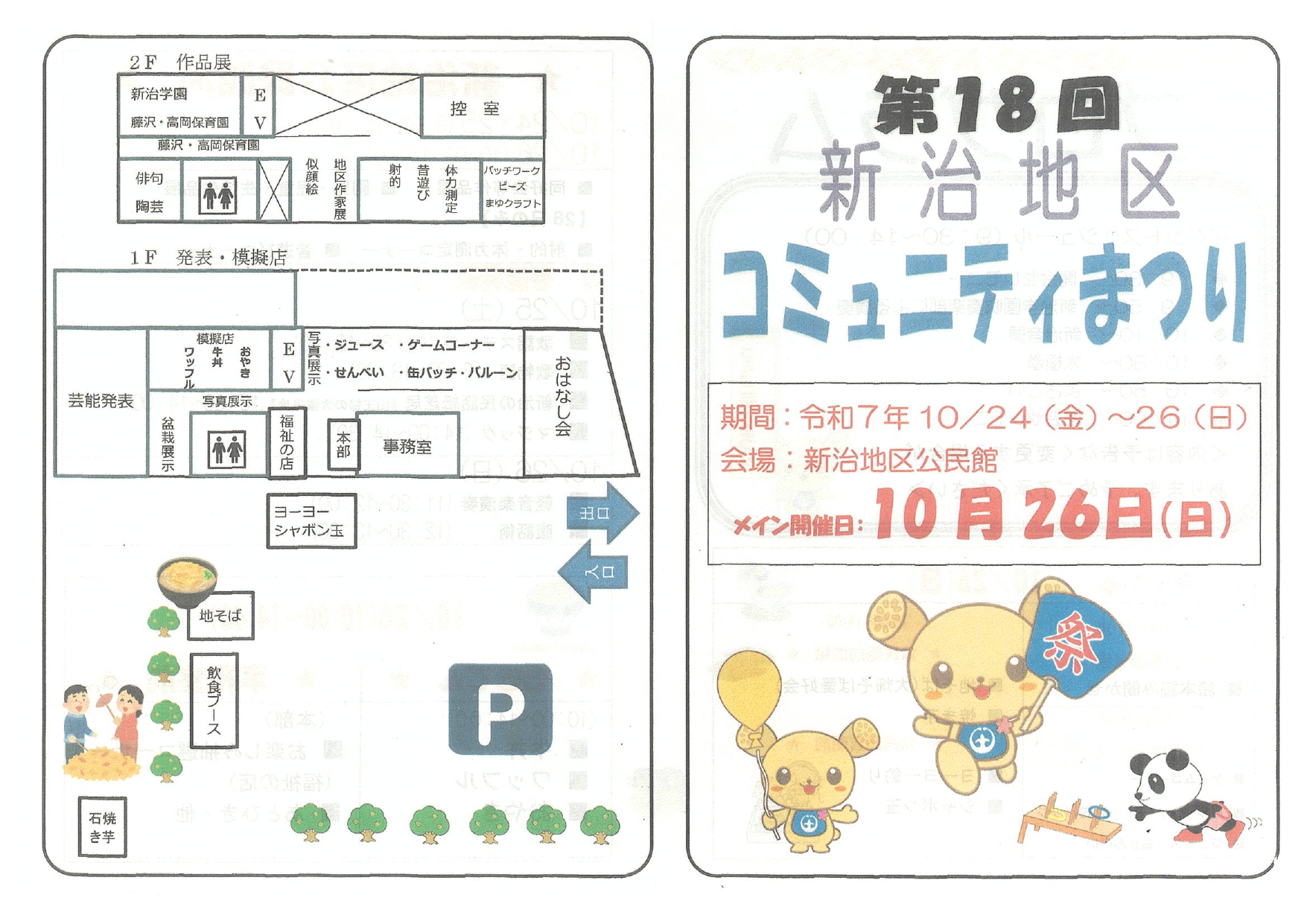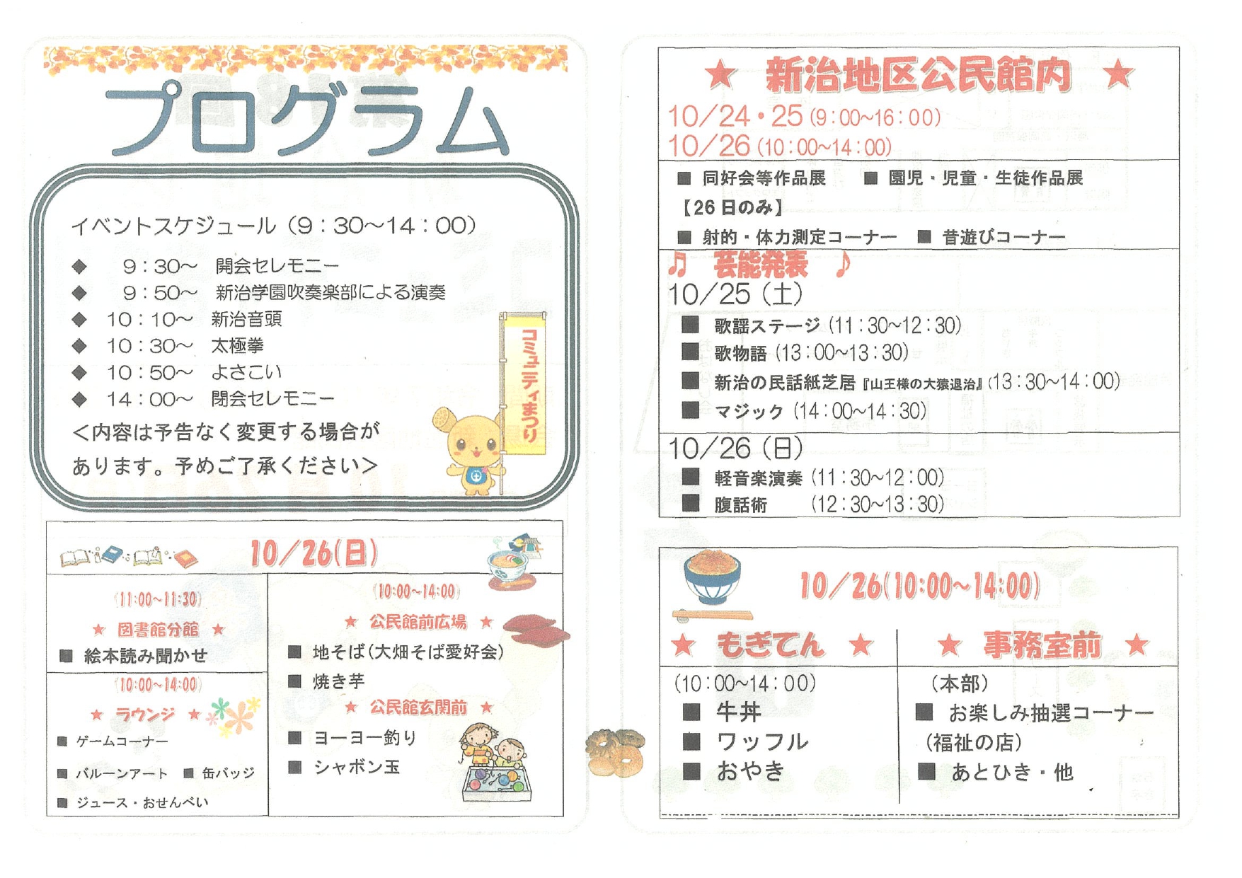 <新治地区コミュニティまつり> 日時:10月25日(土) 9時~16時 10月26日(日) 9時30分~14時 場所:新治地区コミュニティセンター 内容:芸能発表、ゲームコーナー、模擬店など