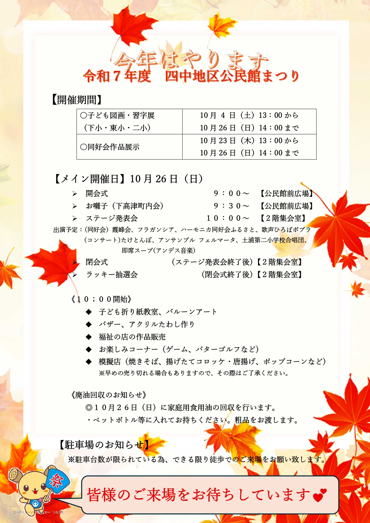<四中地区公民館まつり> 日時:10月26日(日) 9時~15時 場所:四中地区公民館 内容:同好会発表会、模擬店など
