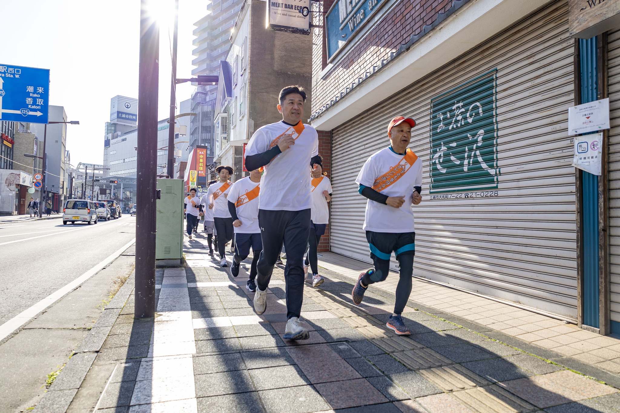 児童虐待防止を呼びかけるオレンジ色のたすきをリレーして、ゴールの県庁までつなぎます。