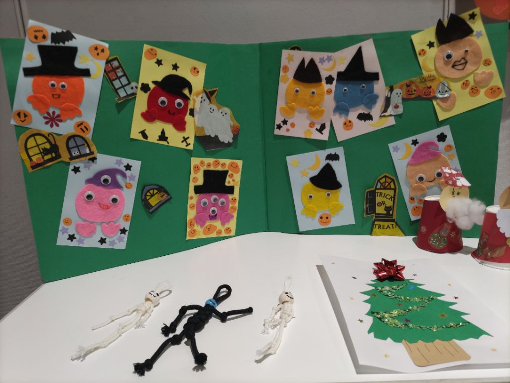 松ぼっくりツリーなどの季節感あふれる作品から、アクセサリーやポーチなどの小物まで、