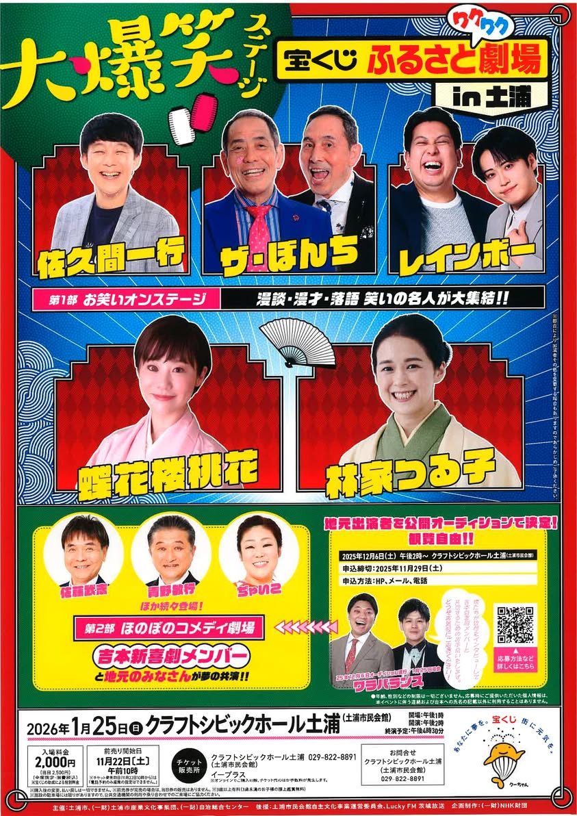 今月も、漫談・漫才・落語の名人が大集結する「宝くじ ふるさとワクワク劇場 in 土浦」や、