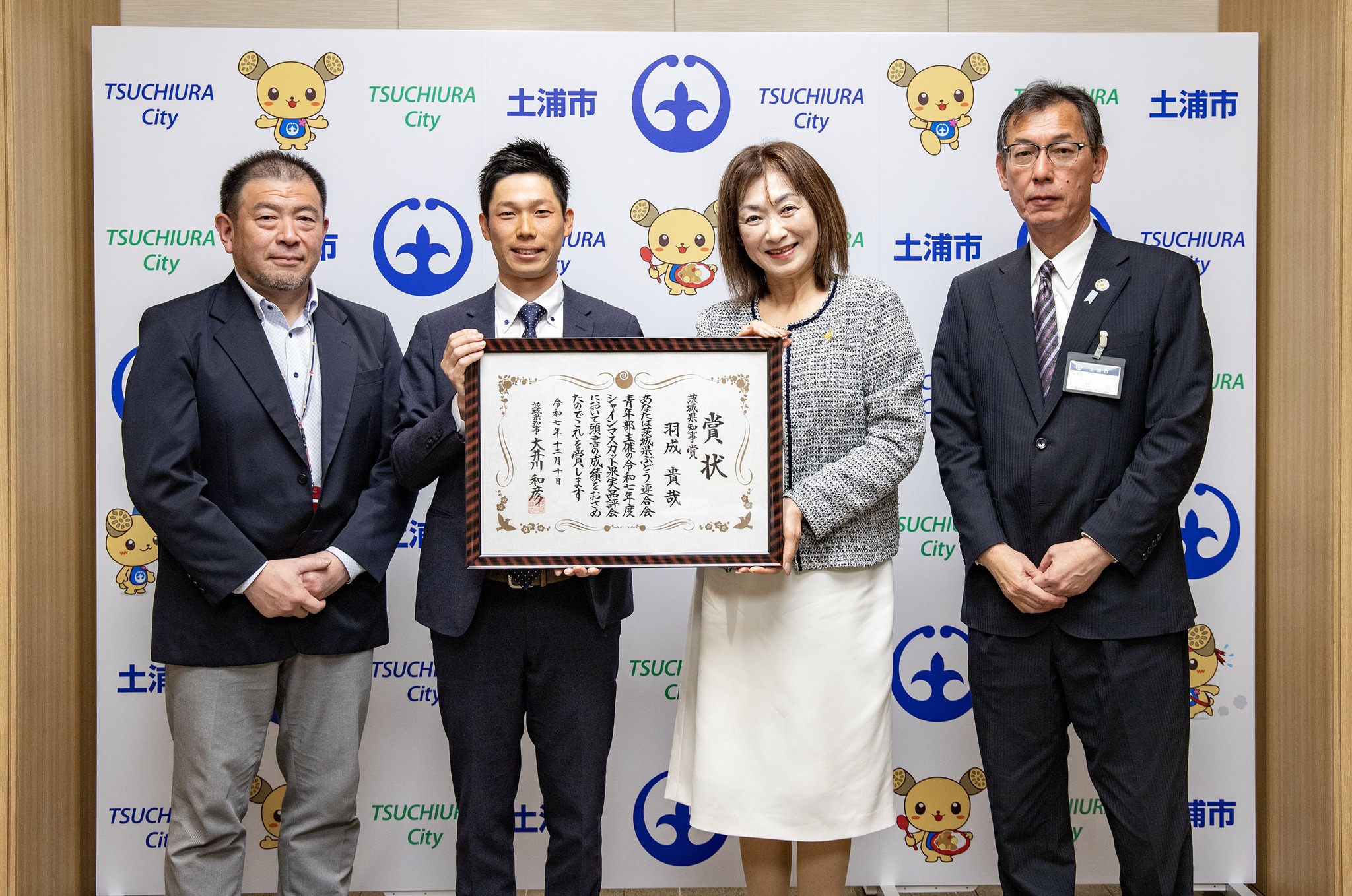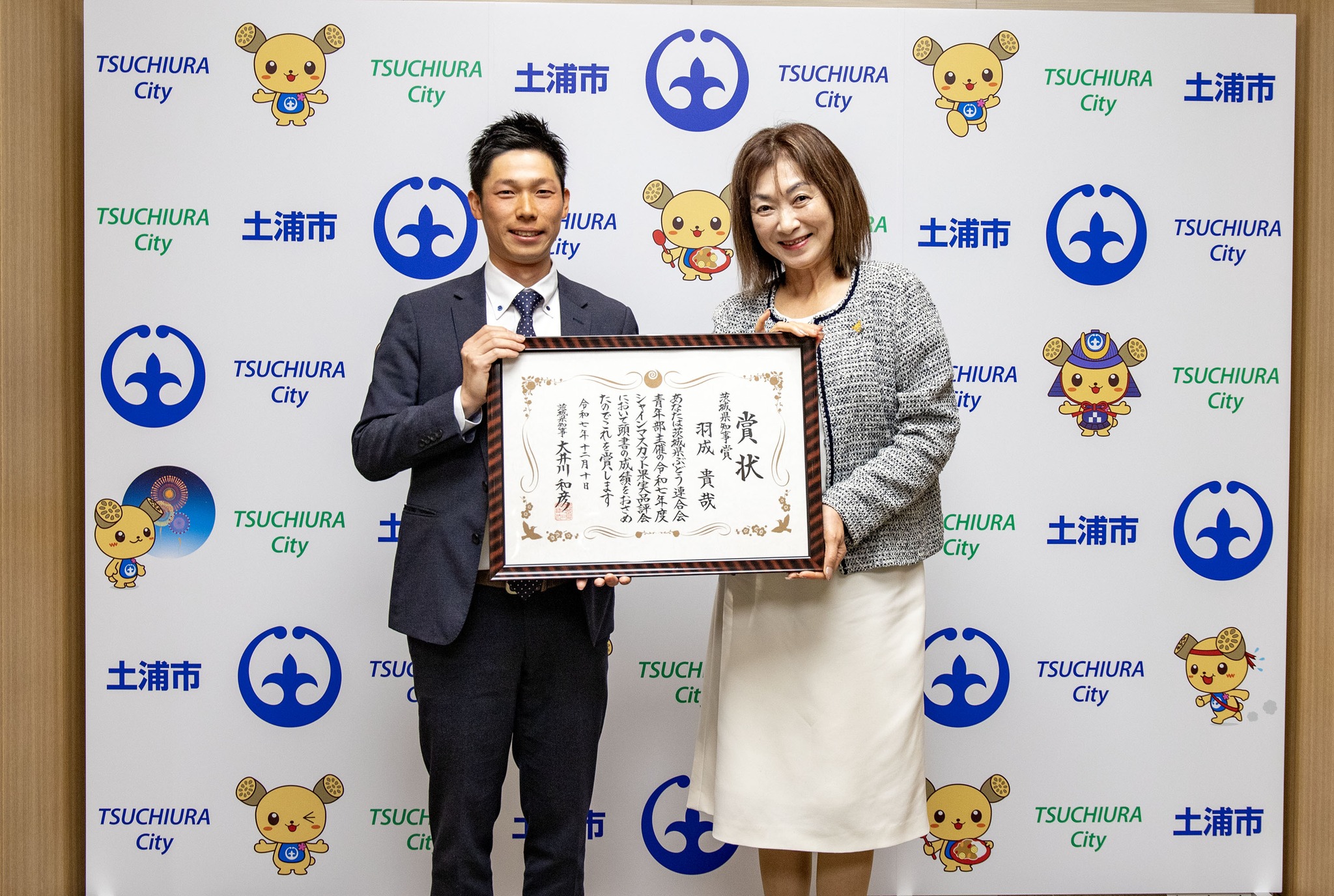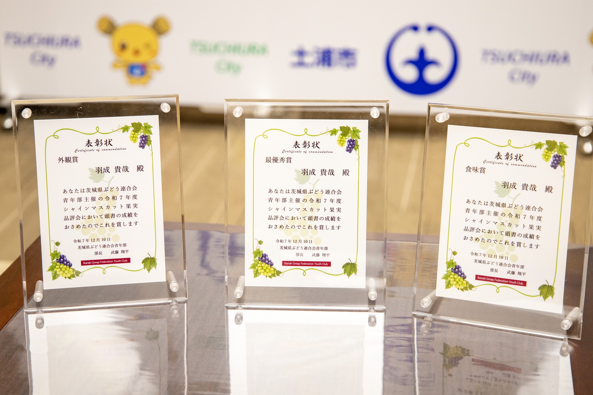 茨城県ぶどう連合会青年部が主催の「第4回 シャインマスカット果実品評会」で、土浦市内にあるケロケロ農園の羽成貴哉さんが最優秀賞を受賞され、報告に来てくれました!