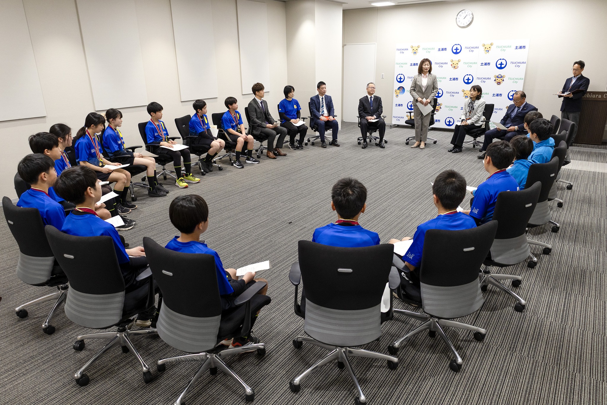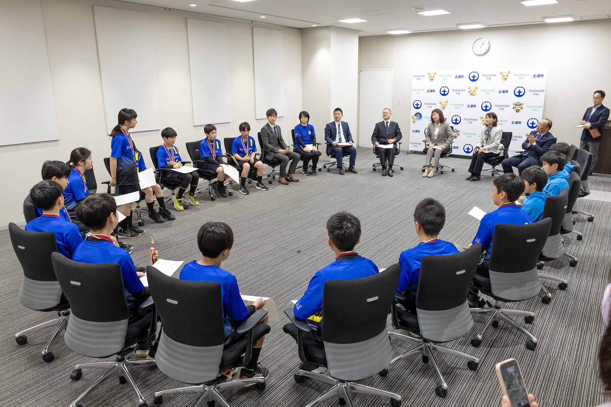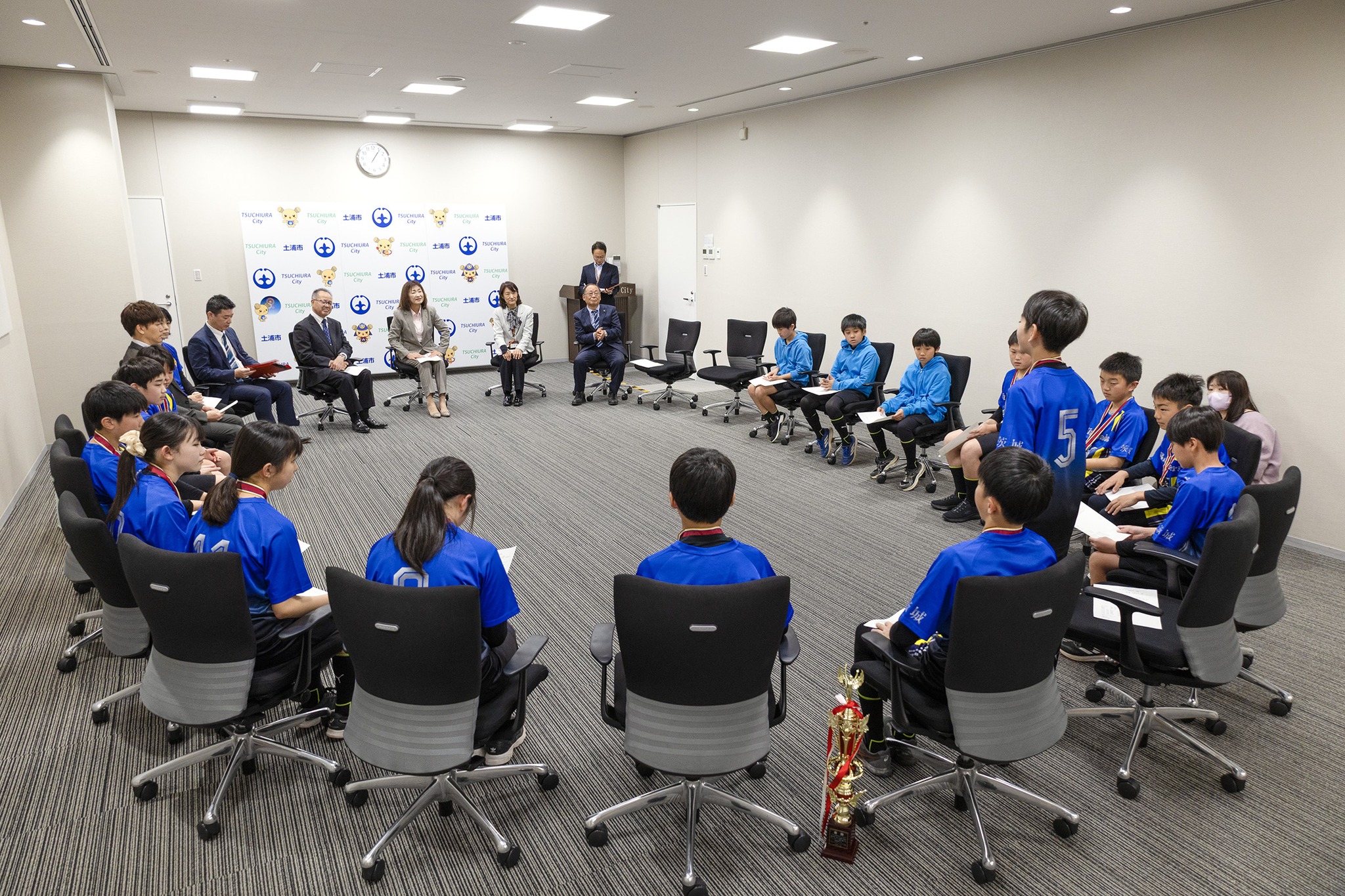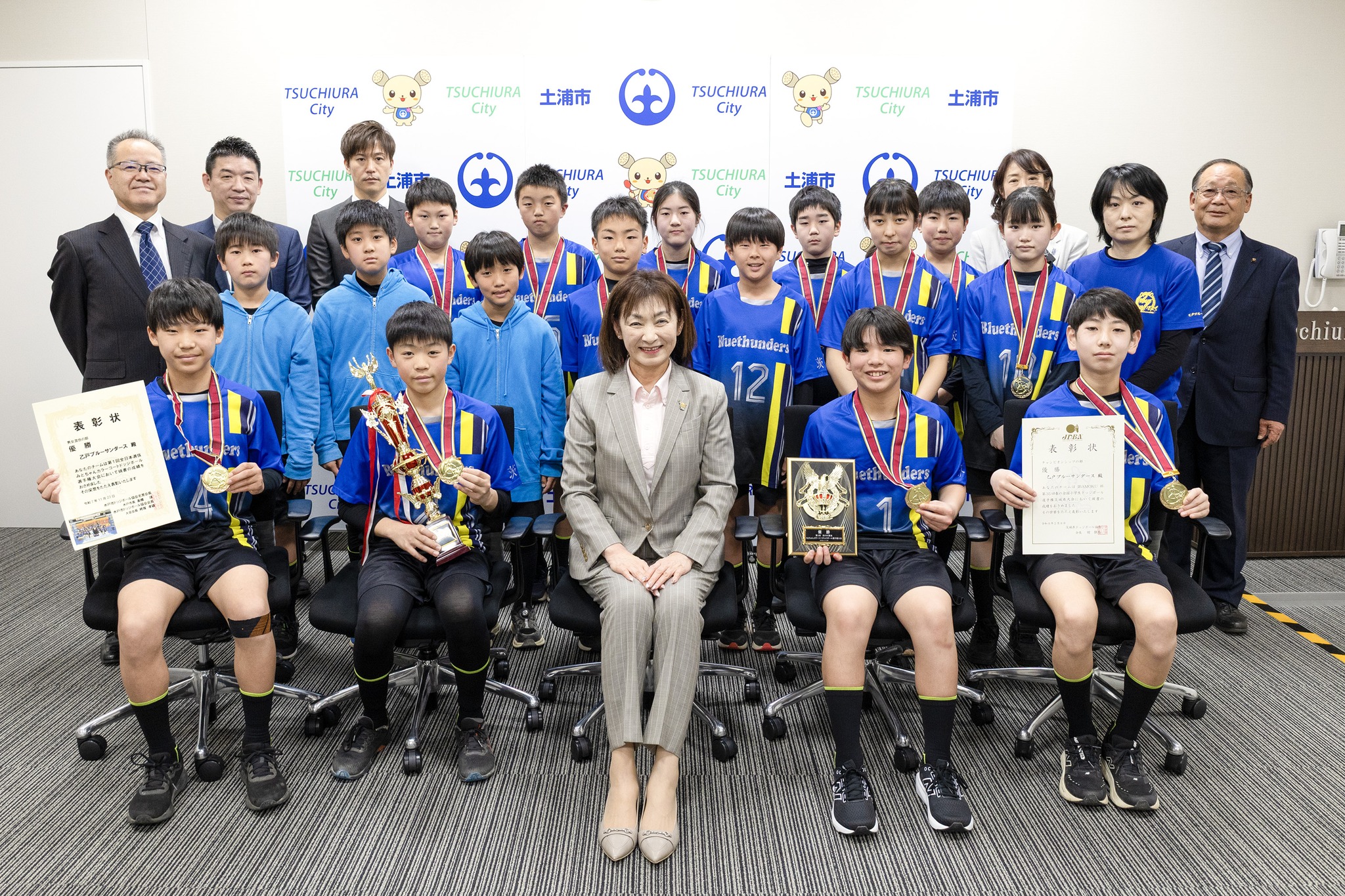 土浦市の乙戸小学校地区の小学生ドッチボールチーム「乙戸ブルーサンダース」の皆さんが「第35回春の小学生ドッチボール選手権茨城県大会」で見事優勝し、報告に来てくれました!